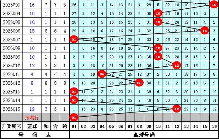 在历史同时第016期开奖中:蓝球号码012路比为4:10:9,本期蓝球参考1路号码,独蓝看好01。